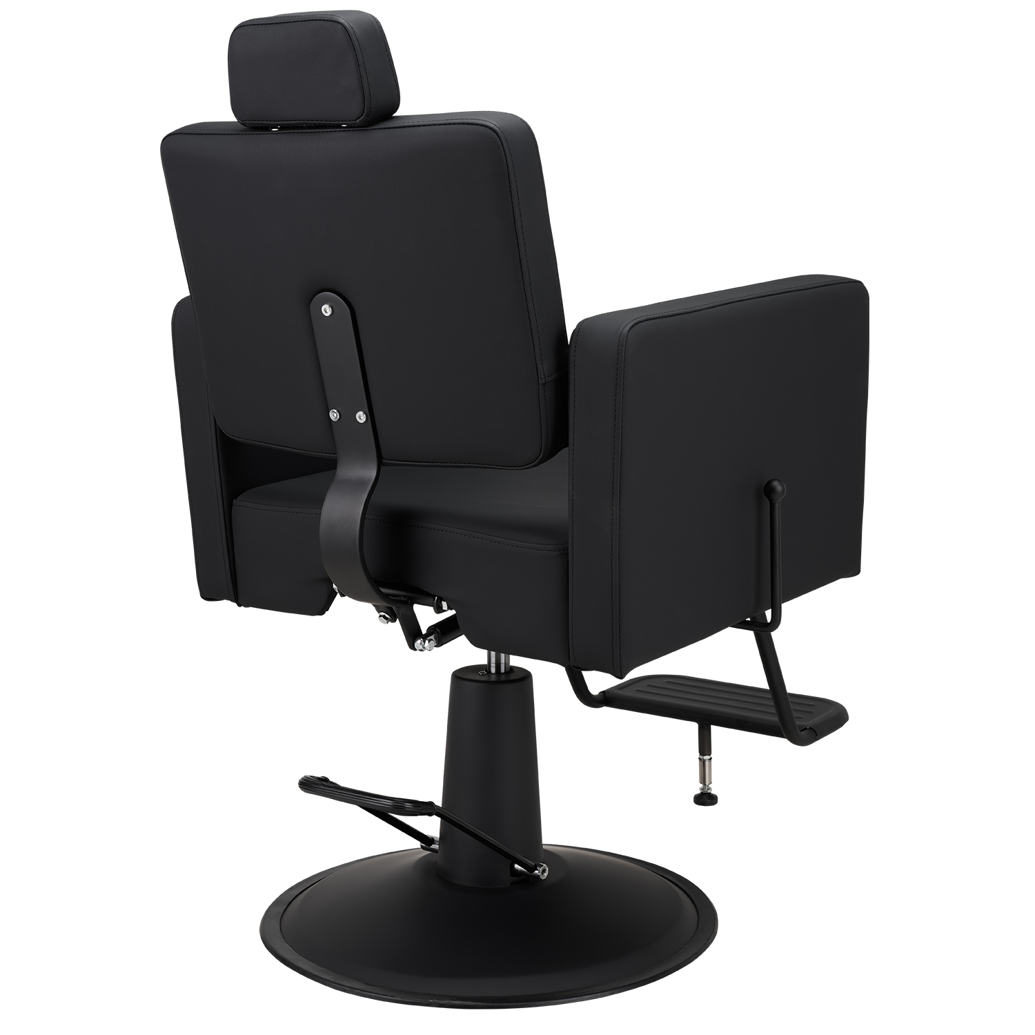 Professioneller Friseurstuhl mit vollständig gepolstertem, breitem Sitz für optimalen Komfort während langer Arbeitstage. Die regulierbare Rückenlehne lässt sich neigen und passt sich individuellen Anforderungen an. Die verstellbare Kopfstütze und das integrierte Fußteil ermöglichen ergonomische Positionierung für verschiedene Behandlungen. Die offene Rückenlehne vereinfacht die Reinigung und Hygiene. Hochwertige schwarze Polsterung mit stabilem hydraulischen Pumpensystem und rundem Sockel für sicheren Stand im Salon.