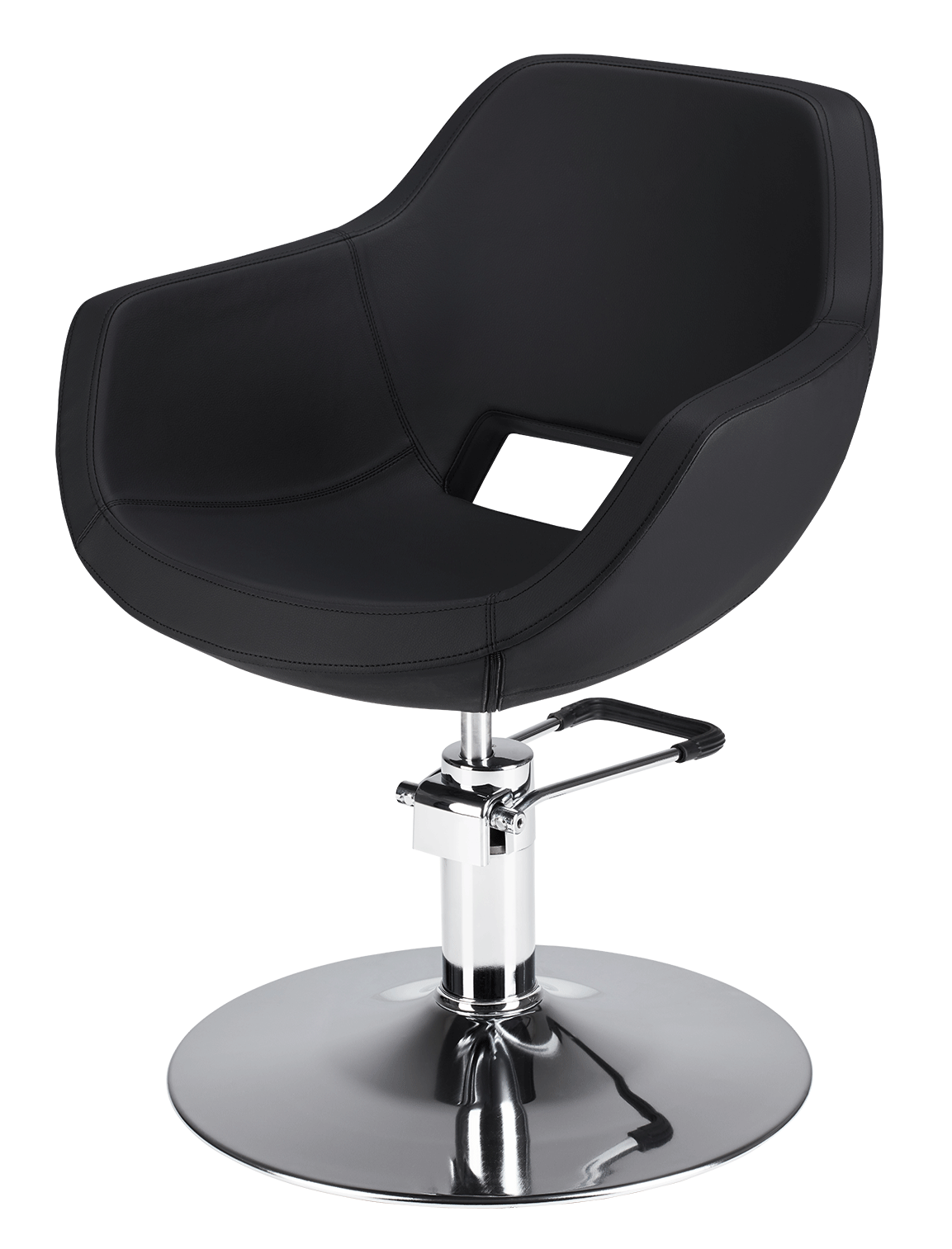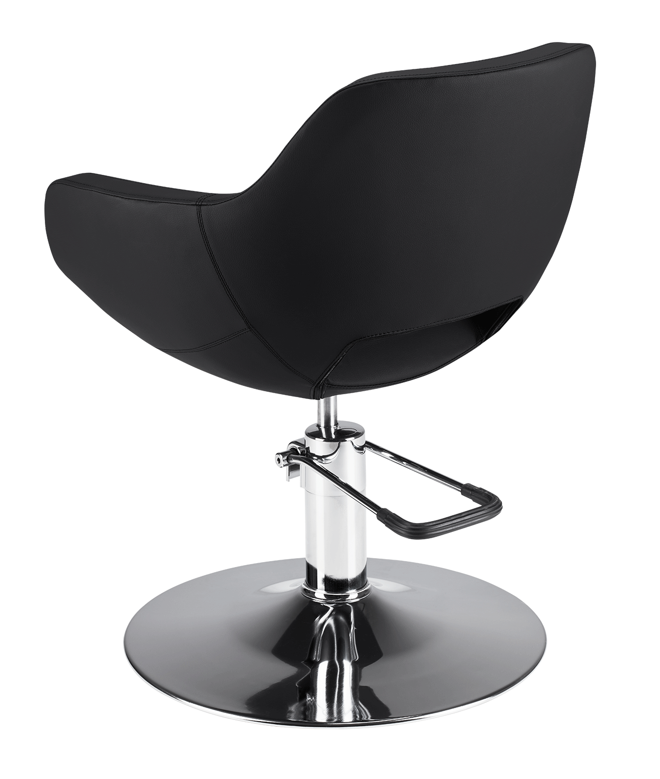 CDE Salondesign Express – Friseurstuhl Jersey Der Jersey besticht durch seine vollständig gepolsterte Sitzfläche mit offenem Rückenlehnen-Design, das optimale Bewegungsfreiheit für Friseur- und Barbershop-Arbeiten bietet. Die hochwertige Polyurethan-Schaumstruktur garantiert langlebigen Komfort und einfache Reinigung – ideal für den täglichen Salon-Einsatz. Die schwarze Polsterung wirkt zeitlos elegant und kaschiert Verschleiß zuverlässig. Die hydraulische Pumpe mit verchromtem Rundfuß ermöglicht stufenloses Höhenverfahren und verleiht dem Stuhl Stabilität sowie Premium-Optik. Mit einer Sitzhöhe von 48 cm, Armlehnen auf 26 cm und kompakten Außenmaßen (63 × 53 cm) passt der Jersey perfekt in moderne Salon-Layouts und bietet Friseur und Kunde ergonomische Sicherheit während der Behandlung.